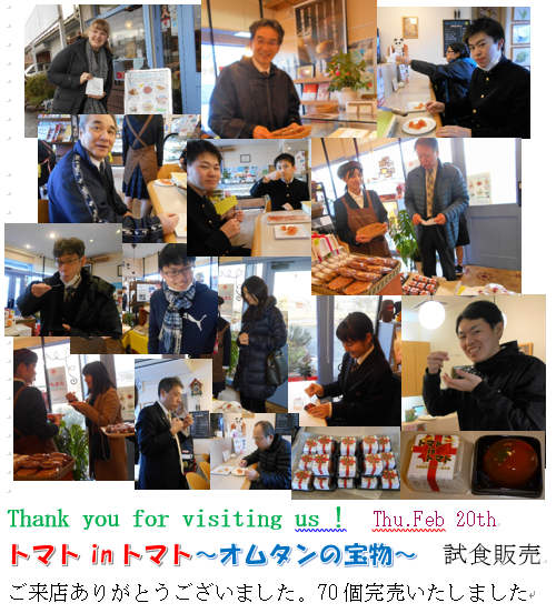 70個準備したスイーツは、2時間で完売しました。試食して下さったお客さんからは、「さっぱりしていて美味しい」「周りのくず餅の舌触りが良かった」「透明で綺麗!」という声を頂きました。足を運んで下さった皆さん、ありがとうございました。トマトinトマト 試作販売のお知らせ