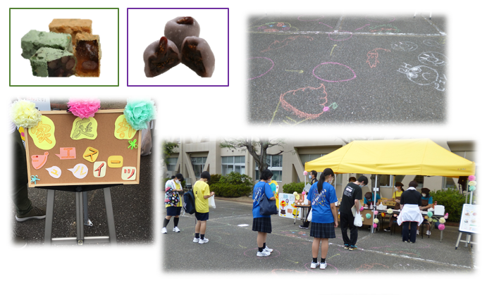 10月3日(土)宝高祭でジュエルスイーツを販売しました。いつも松月堂さんで販売していない「末森の風」と「永福大福」も販売しました。今年は、前売り券制にした所、多くの注文を頂きました。ありがとうございます。ソーシャルディスタンスを保つため、お店の前に並ぶ場所をチョークで楽しく描きました。1年生にとっては、初めての販売でしたが、とても元気に接客ができていました。