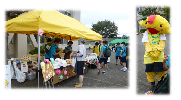 特に、紋平柿のドライフルーツ“KAKKY”は、商品化までに、アイデアやネーミングの提案、検討会での情報共有、加工補助等かかわりを持たせていただきました。この日は、生徒にとって初めての外部販売となり、試食を勧めたり、商品説明をするなどを行いました。試食を勧めた生徒は、「お客さんに「あんまい!あんまい!」と東間の紋平柿のことを、率直にそう言ってもらえて嬉しかった」「もともとは渋柿だったことを説明したから、試食して甘さに驚いてくれた」など、買ってくださる方々とのやりとりからも心地の良い刺激をいただきました。