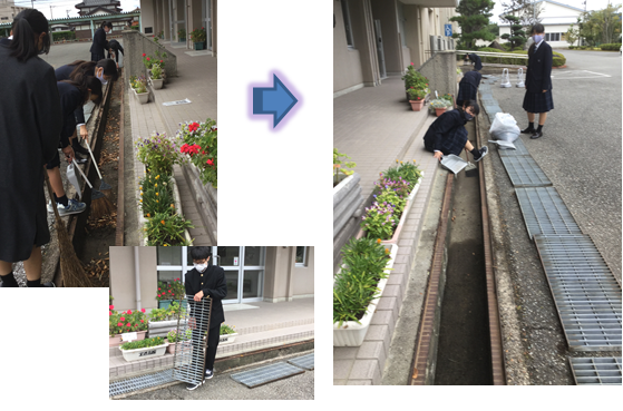 部活動のボランティア活動として、部員5名で生徒玄関前の溝掃除を行いました。目立たない所ですが、日頃なかなか掃除できない場所を考えました。きれいになって、気持ちもすっきりしました。