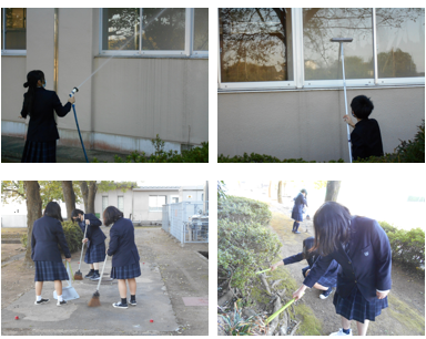放課後、茶道部4名、美術部8名(うち2名は兼部)で中庭の窓と落ち葉の清掃をしました。