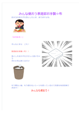 新型コロナウイルス感染症の拡大防止のために、「新しい生活様式」の下での学校生活が続いています。13日(日)には「まん延防止等重点措置」「県緊急事態宣言」が解除されたものの、感染再拡大を防ぐ一人一人の意識が求められています。家庭部では、このような中、私たちにできることはないか…と部内で議論をかさねてきました。その中、「マスクを外し、食事をした後」、昼食後の机上を拭くことを奨励してはどうか?との意見をきっかけに、ささやかながらできることに向け、活動を重ねています。みなさんもぜひ、自宅で習慣化してみてください!