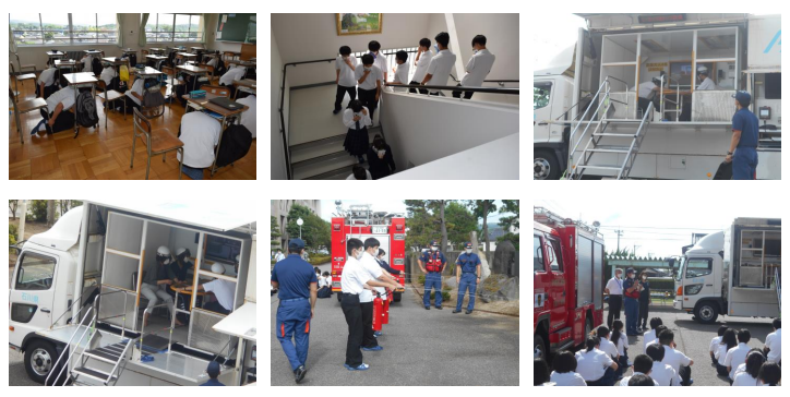 全員の安全を確認した後、各クラス4名ずつ起震車の体験、5名の生徒が水消火器の訓練をしました。