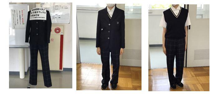 来年度導入予定の女子用スラックスの見本です。スカートとの選択になります(両方可)。生地はスカートと同じものになり、夏用・冬用両方準備する予定です。
