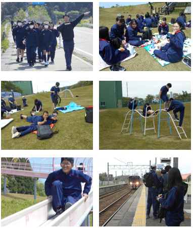 ゴールデンウィークの中日、涼しい風に吹かれながら、往復約8.4キロの道のりを歩きました。目的地の公園では、男子グループ・女子グループで昼食をとった後、遊具で楽しんだり、フリスビーやボールで遊んだりして、生徒はのびのびと楽しんでいました。敷浪駅発の電車で参加者全員家路につきました。