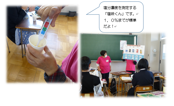 「朝食をとることの大切さ」「1日にとる塩分・糖分の量の目標」について、実物を提示しながら分かりやすい説明で、生徒はうなずきながら、しっかり聞いていました。その中で、自宅からみそ汁を持参した生徒は、塩分濃度測定をして、日頃食べている汁物の味付けの濃さについて振り返る良い機会になりました。今年はコロナウイルス感染予防のため、調理実習を行うことはできませんでしたが、人生の先輩から大切なアドバイスをいただくことができました。