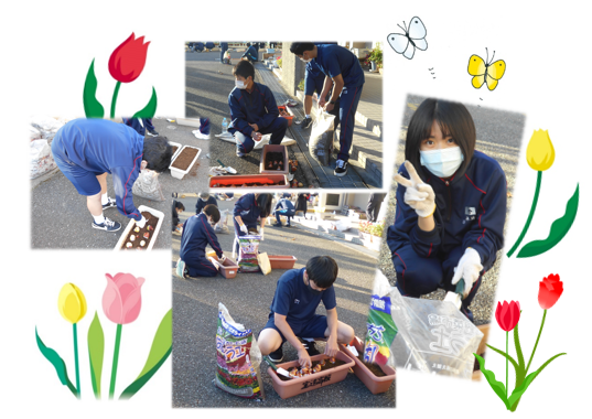 さわやかな秋晴れの空のもと、1年生全生徒および教職員が協力してプランターに土を入れ、チューリップの球根を植えました。今年はフィジカルディスタンスに気を付け、一人一鉢に責任をもって取り組みました。