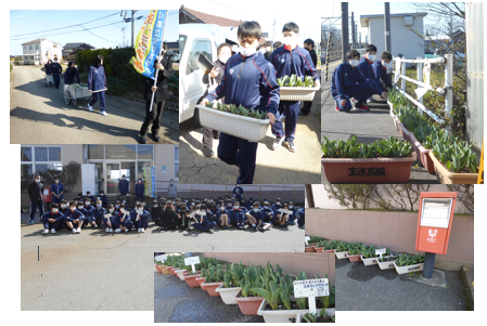 昨年11月24日(火)に1年生全員で植えたチューリップの球根が育ちました。満を持して、1・2年生全員で、宝達駅西口(下りホーム側)正面とホームの一部に合計47鉢置きました。町の皆さんに少しでも喜んでいただけると嬉しいです。ぜひ、生徒が書いたメッセージもご覧ください。給水などの世話は、ボランティアの生徒が分担して週に2回ほど行います。きれいに咲きますように!