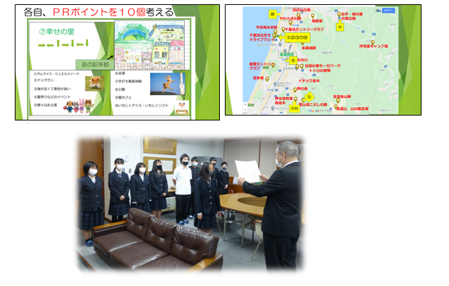 発表は県内加盟校のうち5校より6つの作品がエントリーされました。本校は3番目の発表で、「宝達志水町に『道の駅』をつくろう」というテーマで発表しました。これは、「宝達志水町の良い所をPRするため、もし自分が道の駅をつくるとしたら・・・」という想定で、部員全員で道の駅の「外観」「建てる場所」「PRポイント」を考えたものです。11の道の駅のデザイン画を学校に掲示し、いしかわ教育ウイーク時に全校投票を行いました。投票でいただいた意見をもとに分析や改善点を考え、成果と課題をまとめました。