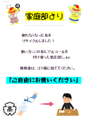 新型コロナウイルス感染症の拡大防止のために、「新しい生活様式」の下での学校生活が続いています。13日(日)には「まん延防止等重点措置」「県緊急事態宣言」が解除されたものの、感染再拡大を防ぐ一人一人の意識が求められています。家庭部では、このような中、私たちにできることはないか…と部内で議論をかさねてきました。その中、「マスクを外し、食事をした後」、昼食後の机上を拭くことを奨励してはどうか?との意見をきっかけに、ささやかながらできることに向け、活動を重ねています。みなさんもぜひ、自宅で習慣化してみてください!