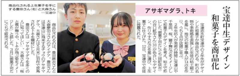 生徒85人が、町の名所や行事、季節や植物などを、粘土を使ってデザインしたものを実際に上生菓子として商品化しました。経緯や内容は新聞記事を掲載しますのでお読みください。