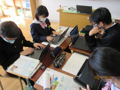 2年生は中国・四国地方の学習で,中国・四国地方で過疎・過密問題が同時に起こっている理由を,単元の学習を活かしながらChromebookでその考えをまとめていました。