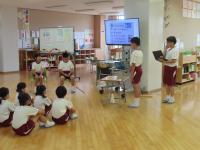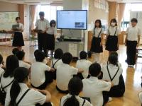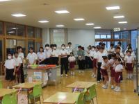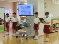 始めに自己紹介をしていただきました。その後、楽器の紹介、クイズ、そして、ドレミパイプ体験、最後に全員で「つばめ」「虹」を歌いました。ドレミパイプ体験では、「ド」「レ」「ミ」「ファ」「ソ」の5つのグループに分かれて「聖者の行進」を演奏しました。初めての経験で音をうまく出すことが難しいようでしたが、楽しんで演奏していました。また、最後に全員で歌った「つばめ」は青潮祭で前期ブロックが躍った曲です。歌った後は、「踊りたい!」とつぶやいている子もいました。楽しいコンサートをありがとうございました。