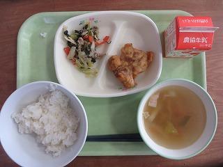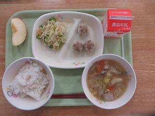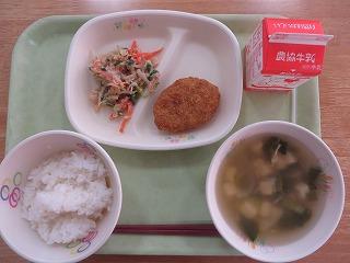 白ごはん 牛肉と野菜の炒めもの 野菜とチーズのサラダ じゃがいもとかぼちゃのミルクスープ 牛乳