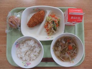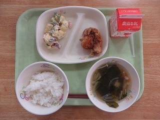 白ごはん 鶏肉の唐揚げ カボチャサラダ レタススープ 青りんごゼリー 牛乳