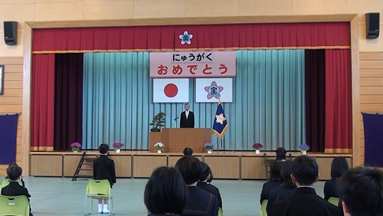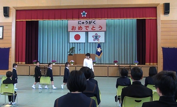 4月5日(月)午前10時より令和6年度入学式が行われました。天候にも恵まれて、晴れて4名の新入生が本校に入学しました。担任の先生が呼名した時には、「はい!」と大きく堂々とした声で返事をしていました。式辞では、倉見校長先生が、「学校は楽しいところです。楽しく遊び、また楽しく学びましょう。」そして、本校の伝統である「あ・い・ど・る+下足」についてもお話されました。金田PTA会長さんからも温かなご祝辞をいただきました。そして、2年生の谷中さんが「わからないことがあったら、お兄さん・お姉さんや先生方に聞いてください。」と優しく歓迎の言葉を述べていました。新入生4名もきちんとお話を聞き、最後までほどよい緊張感をもって式に臨むことができました。宝立小中学校の仲間入りを果たしました。