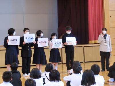 4月9日午後1時25分から、本校体育館において自問清掃のオリエンテーションがありました。「自問清掃」について、担当の花木先生と代表児童生徒5名による説明と実演がありました。自問清掃に取り組みながら、5つの玉『「粘り玉」「親切玉」「発見玉」「感謝玉」「正直玉」』を磨き、身につけることができます。これらは、学校生活や家庭生活においても発揮することができます。わかりやすい説明だったので、1年生は十分に理解できたと思います。また、2~9年生もしっかりと再確認できたと思います。これから、皆さんで一緒に学校と心をきれいにしていきましょう。