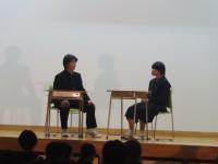 【全校集会(表彰式)】 【全校集会で話を聴く様子】