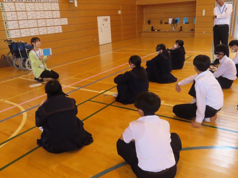 午後には、8・9年生の高齢者疑似体験学習が行われました。社会福祉協議会の方2名を講師にお招きし、車椅子体験や視界の体験をしたりしました。実際に体験することで、お年寄りの気持ちを理解することができました。講師の皆さん、お忙しい中、ありがとうございました。