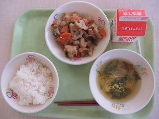 白ごはん 鶏肉とれんこんの揚げがらめ かきたまみそ汁 牛乳