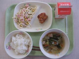 白ごはん フライドチキン スパゲティサラダ 野菜スープ 牛乳