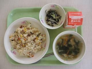 チキンピラフ ポークビーンズ コーンサラダ アメリカンチェリー 牛乳
