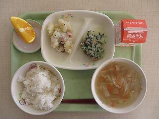 白ごはん タラのホワイトソース ジャーマンポテト オニオンスープ オレンジ 牛乳