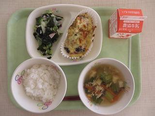 白ごはん えびグラタン 海藻サラダ チンゲン菜と卵のスープ 牛乳