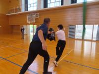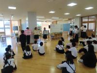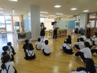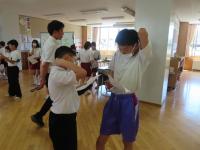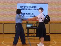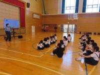 「いかのおすし」の確認、不審者に後ろから抱え込まれた時の逃げ方、後期課程は簡単な護身術について、講話と演習を通して学びました。水口さんの元気な声とわかりやすい映像を使っての講話でしたので、児童生徒も十分に理解し、実践することができました。お忙しい中、たくさんの準備とわかりやすいお話をしていただき、ありがとうございました。