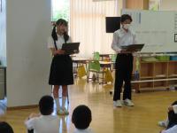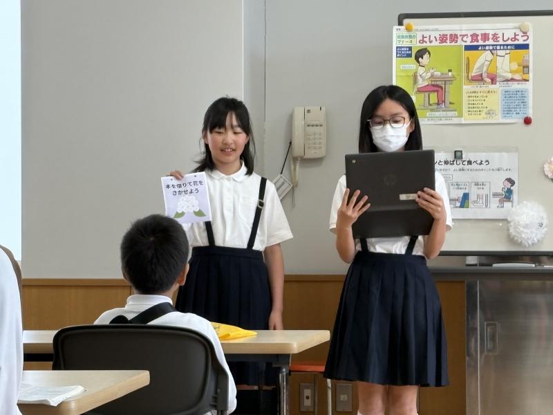 6月2日給食時間に、図書委員(2名)が委員会活動について呼びかけをしました。その時の様子です。各委員会はより良い学校にするために、挨拶運動をはじめ、いろいろなことを企画・提案して取り組み、頑張っています。担当の先生方も児童生徒と一緒になって、考え相談し、アイデアを共有しています。