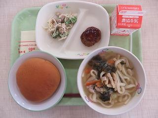 チーズバーガー わかめうどん ブロッコリーのサラダ 牛乳
