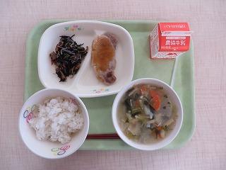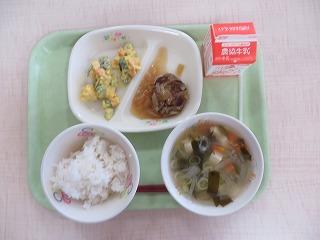 白ごはん 揚げ鶏とれんこんの揚げ煮 かきたまみそ汁 牛乳