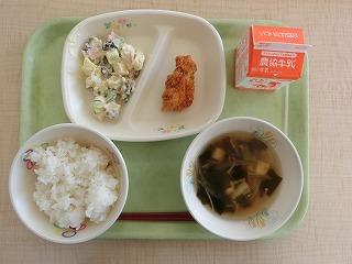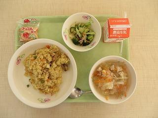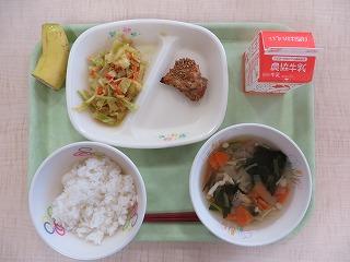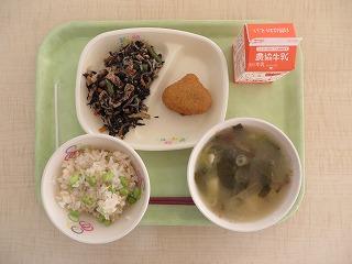 鮭ごはん 牛乳 焼き栗コロッケ ひじきのツナ炒め みそ汁 牛乳