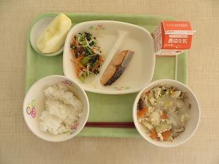 白ごはん 焼鮭 ごまあえ みそけんちん りんご 牛乳