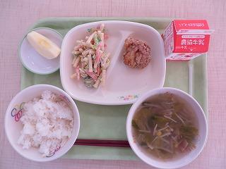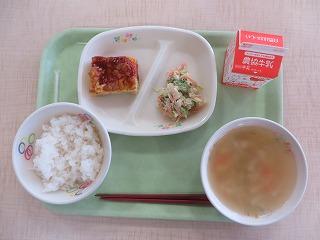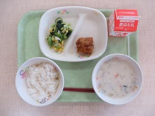 白ごはん 鮭のマヨネーズ焼き もやしのナムル コーンかきたまスープ 牛乳