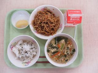 わかめごはん ジャージャー麺 かきたま汁 りんごのコンポート 牛乳