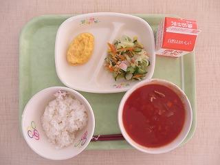 白ごはん ハンバーグトマトソース サラダ パンプキンスープ エクレア 牛乳