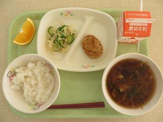 白ごはん 豆腐ハンバーグ 野菜のピリ辛 みそワンタンスープ オレンジ 牛乳