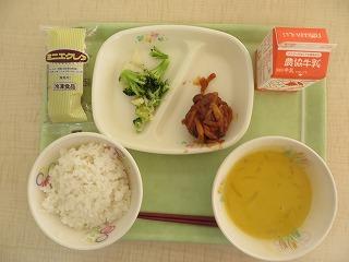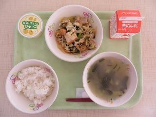 白ごはん 豚肉のキムチ炒め みそ汁 なしゼリー 牛乳