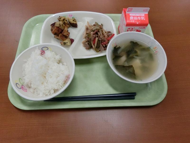 白ごはん チンジャオロース 大学いも みそ汁 牛乳