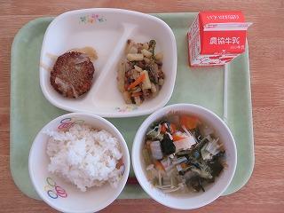 白ごはん いわしハンバーグ玉ねぎソース じゃがいもと牛肉のきんぴら 鶏団子スープ 牛乳