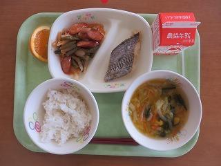 白ごはん 魚の西京焼き ウインナーといんげんの炒め物 野菜スープ オレンジ 牛乳