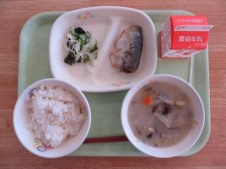 白ごはん サバのみそ煮 わかめの酢の物 すいとん風煮 牛乳