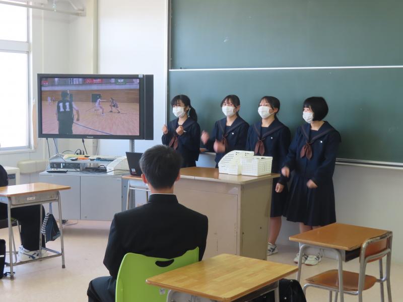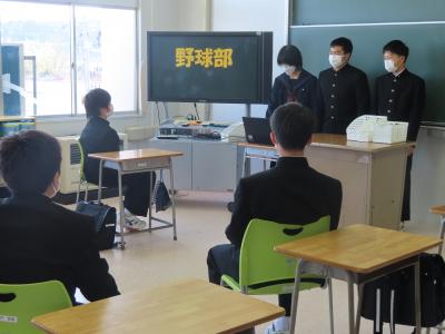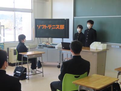 4月10日放課後、7年生教室(英語教室)において7年生を対象の部活動紹介式が行われました。紹介する8・9年生を代表して、9年生石井さんが「しっかり聞いて何部に入るか決めて、入ったら一緒に頑張りましょう」と立派にはじめの挨拶をしました。その後、ソフトテニス部、野球部、女子バスケットボール部の順番で、部員数、顧問名、活動場所、昨年度の試合の様子などを上手に紹介していました。7年生もしっかりと聞くことができました。会の締めとして、部活動入部までの流れを、部活動担当の八木先生が説明しました。本日より部活動見学と体験入部期間が始まりました。入部届けの期日が18日(木)となります。そして、7年生も19日から本格的に部活動がスタートします。5月に入ると各種大会も行われます。目標を持ってしっかりと取り組みましょう。