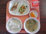 白ごはん はたはたのごまがらめ 発芽大豆のサラダ みそ汁 オレンジ 牛乳