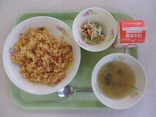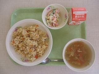 鮭チャーハン マカロニサラダ 中華スープ 牛乳
