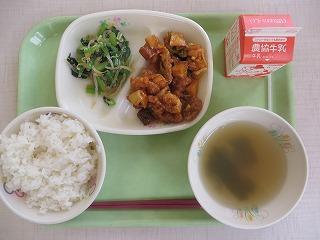 白ごはん 酢豚 もやしと小松菜のあえもの わかめスープ 牛乳