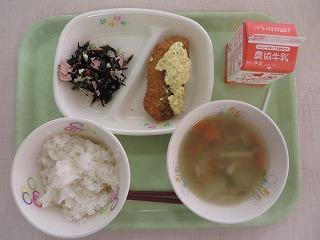 白ごはん 白身魚のタルタルソース ひじきのマリネ 田舎汁 牛乳