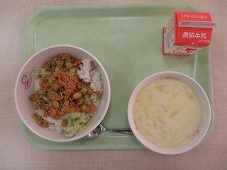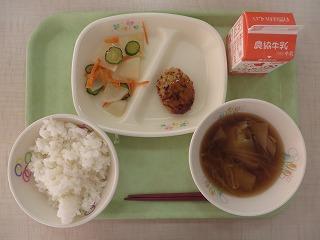 白ごはん 豆腐ハンバーグ 野菜のピリ辛 みそワンタンスープ 牛乳