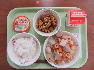 白ごはん 大豆とさつまいもの揚げ煮 おでん エネプリン 牛乳